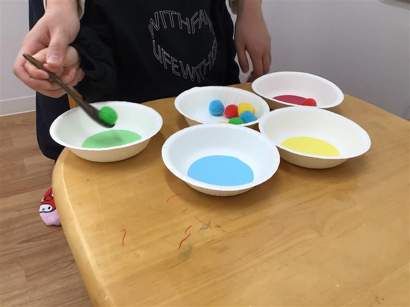 スプーンでフェルトボールをすくい、底がボールと同じ色のお皿に入れる活動の様子です。