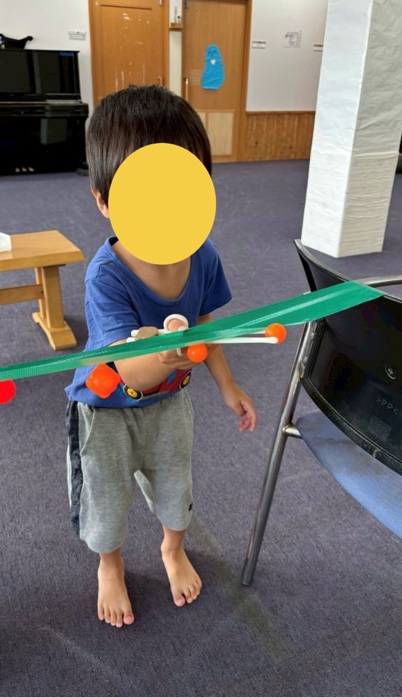 つるつる滑りやすいボールをお箸や矯正箸で掴みガムテープまでもっていって貼り付けます。今回は手の動きが重要となる微細運動や力加減が大切になってくる活動となっています。