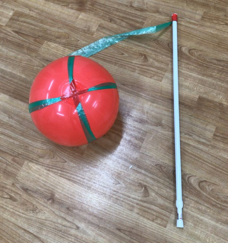 突っ張り棒、紐、テープ、ボールといった100均で揃えられるグッズのみで制作しています。
