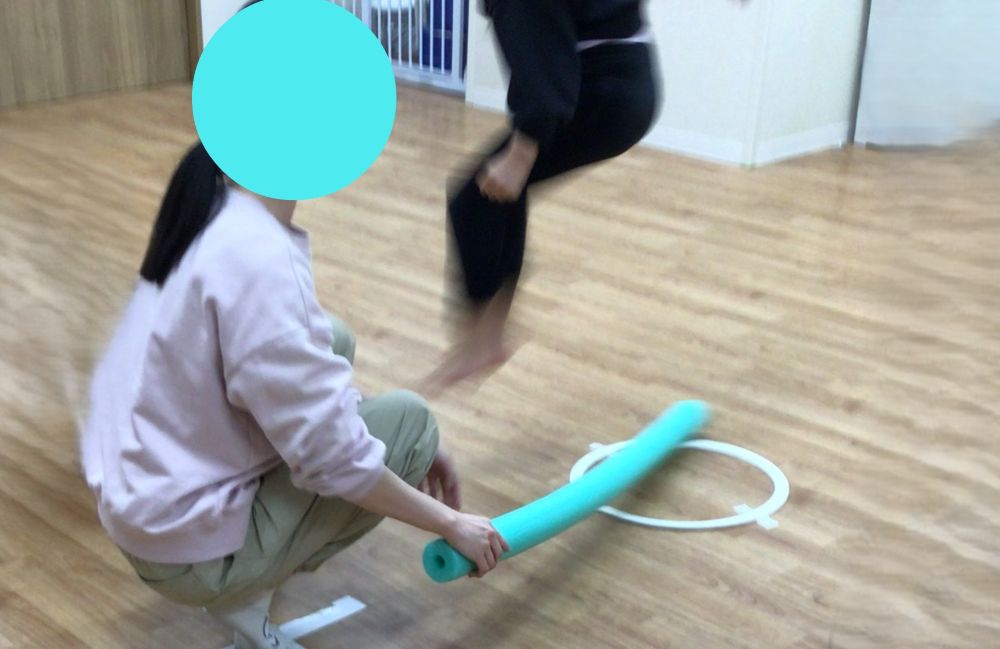 目で棒の動きをよく見てタイミングを合わせるビジョンや、棒の高さに合わせてジャンプするボディーイメージのトレーニングになります。